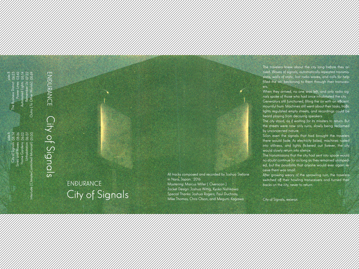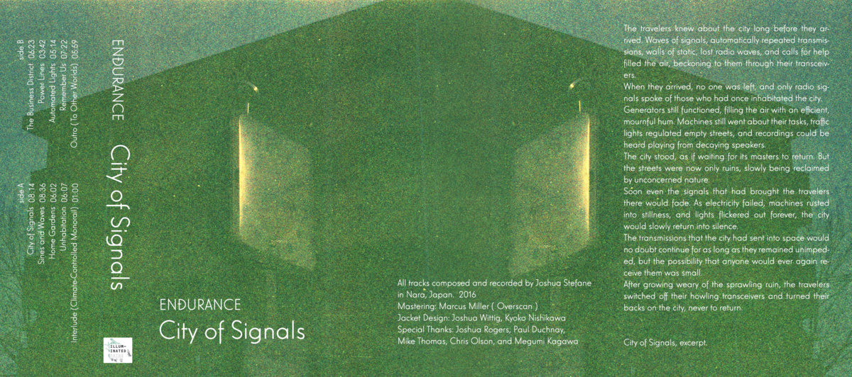 The quiet beauty and sheer stillness of abandoned cities must be breathtaking. To take in the crumbling facades, buckled asphalt, and low-hanging wires through which no current flows can only be a humbling experience. But what if a depopulated city sprang back to life? What if the traffic signals began to function, the sprinkler systems doused the cracked driveways with musty water, and the streetlights came on at night? Canadian ex-pat Joshua Stefane (aka Endurance, currently residing in Japan) posits this scenario with his short story and the accompanying soundtrack City of Signals.